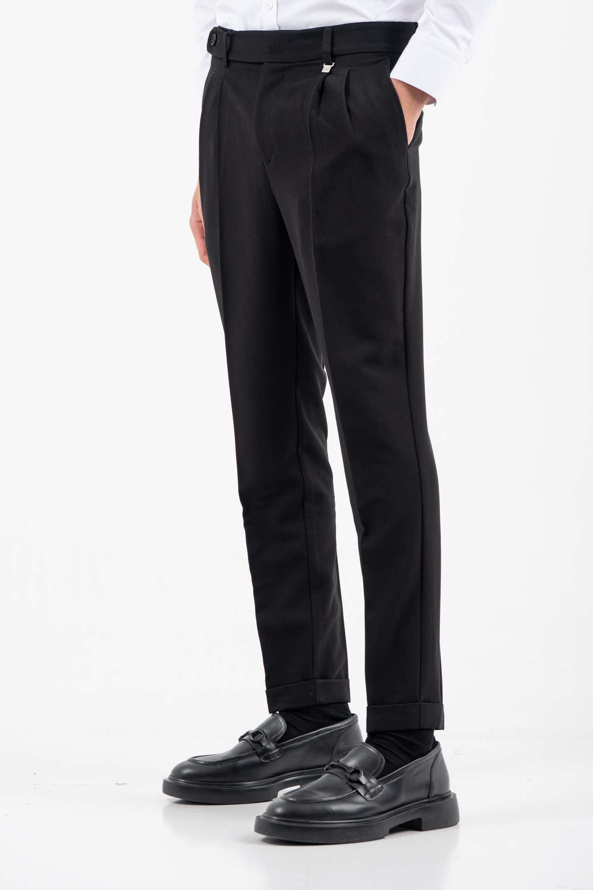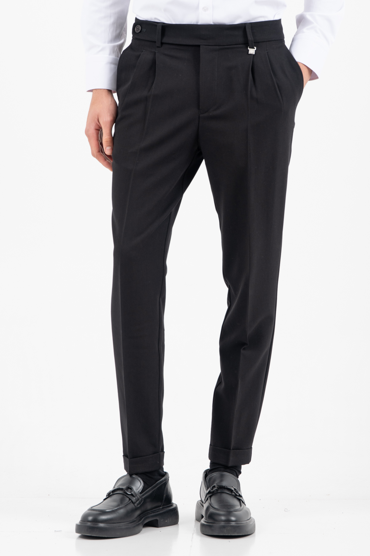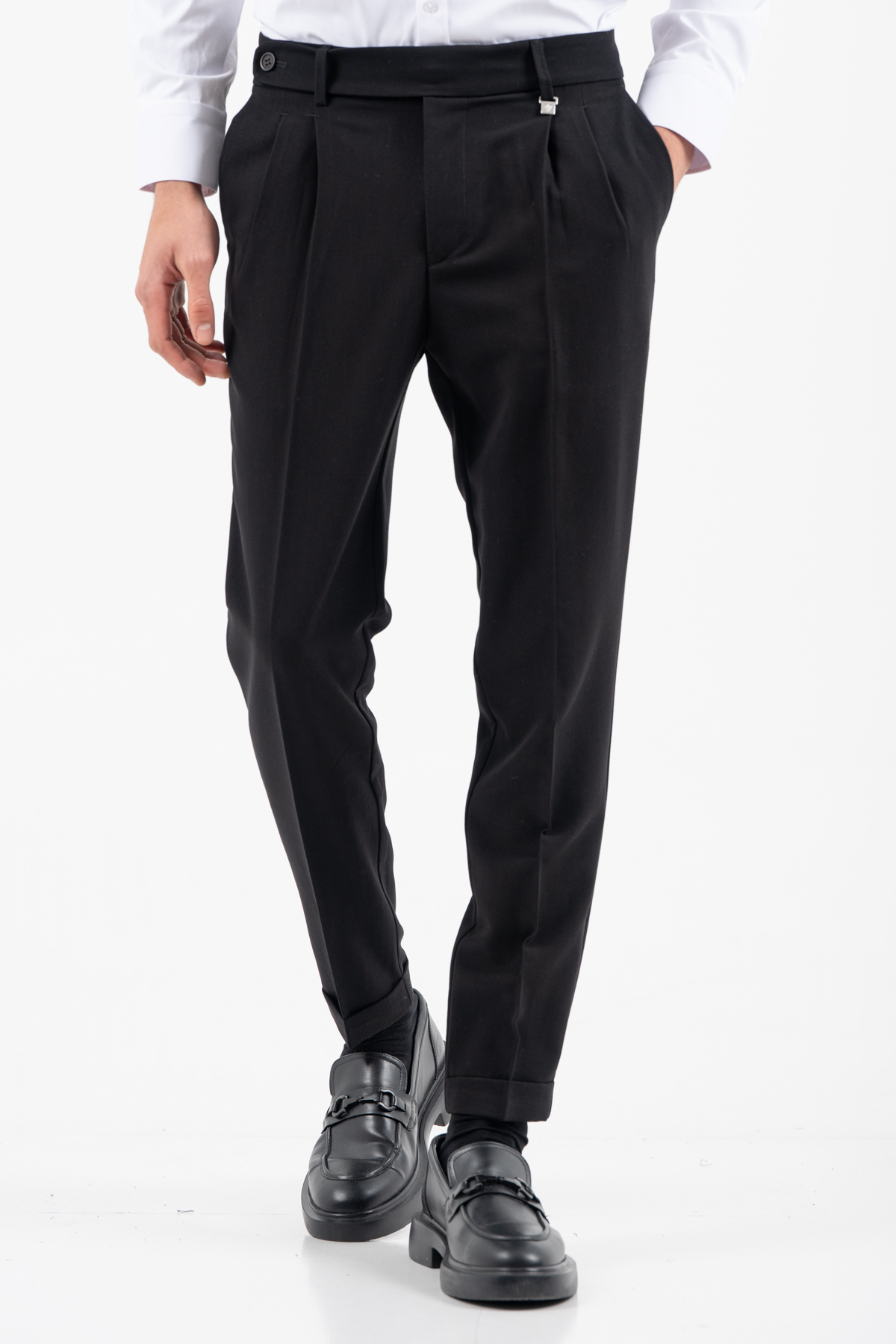 -Παντελόνι σε γραμμή loose δίπιετο και τελείωμα σε ρεβέρ.